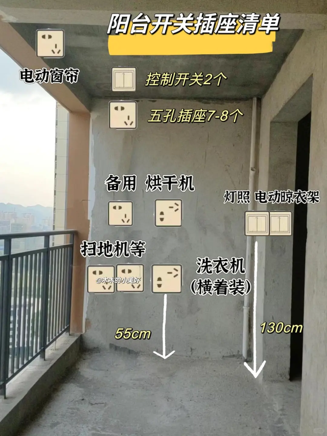 阳台至少要装2-3个防水插座,洗衣机、烘干机、吸尘器、电风扇...用的时候就知道多方便了!
