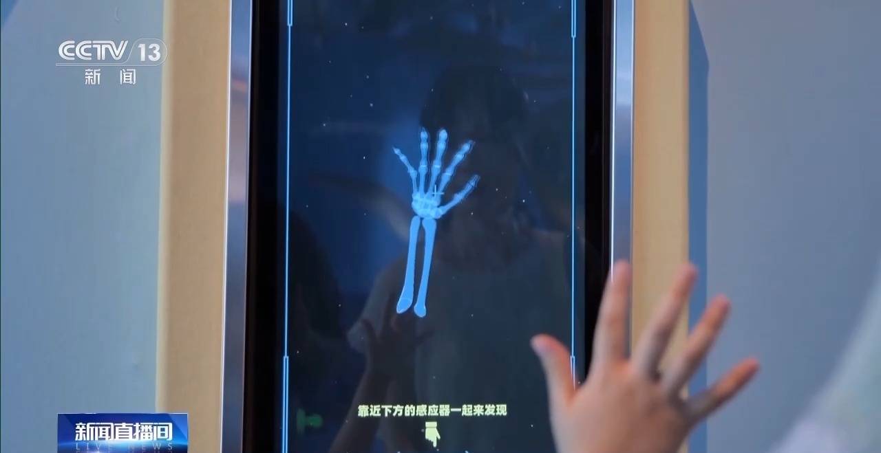 在抹香鲸心脏标本的旁边,还设置了一个心率对比仪,只需要将手指轻轻放在上面,便可测试出自己的心率,还能对比抹香鲸深潜时的心跳次数。而这样的巧思遍布全馆:X光手骨屏,手臂一挥,对比鲸鳍与人类手骨的相似度,连小朋友都能秒懂进化论;体感虎鲸游戏,挥动手臂,模拟虎鲸在大海遨游,动作捕捉技术让虚拟捕食充满刺激。