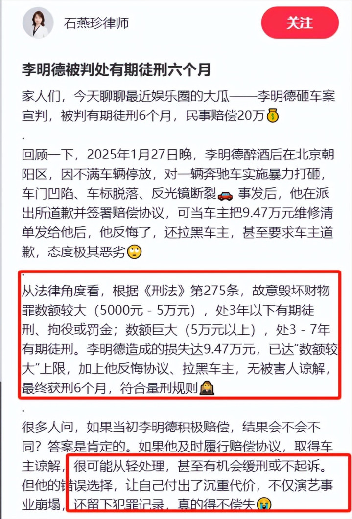 网红律师石燕珍也发帖解读了李明德事件,她表示,如果李明德认错态度好、及时赔偿,取得受害方的谅解,是有可能不需坐牢的。