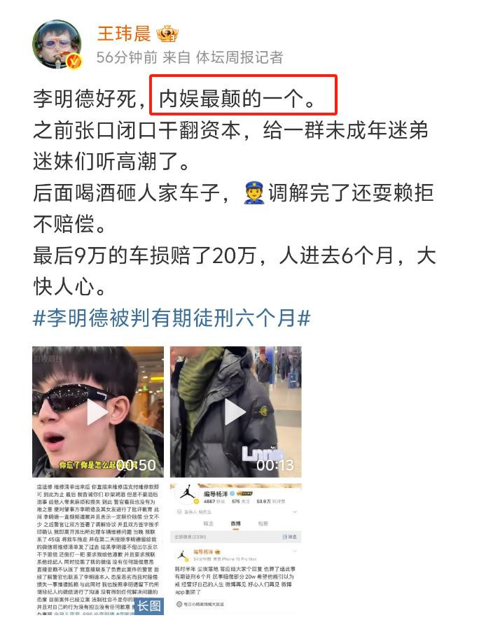 拥有百万粉丝的知名体育记者王玮晨吐槽称,李明德真是娱乐圈最癫的一个,想干翻资本,把自己给干翻了。