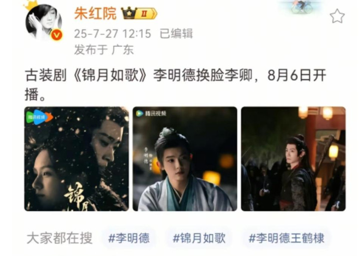 他出事前拍的《锦月如歌》近期已官宣定档,剧中他的角色被换脸成了另一位演员李卿。