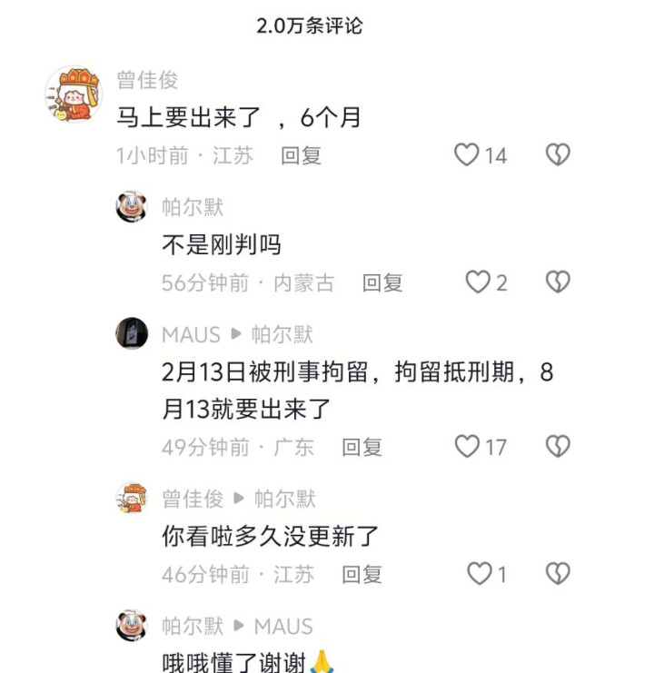根据网友的推算,他此前已被拘留近6个月,按照拘留抵刑期的规则,预计到8月13号就会出狱。
